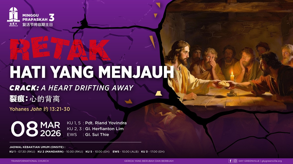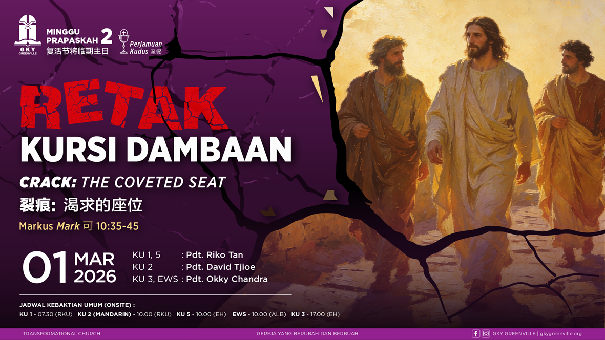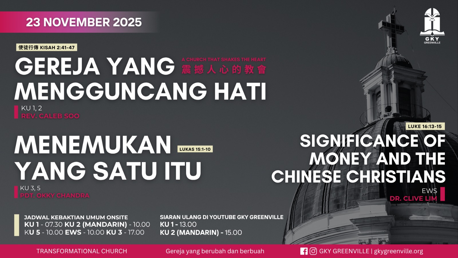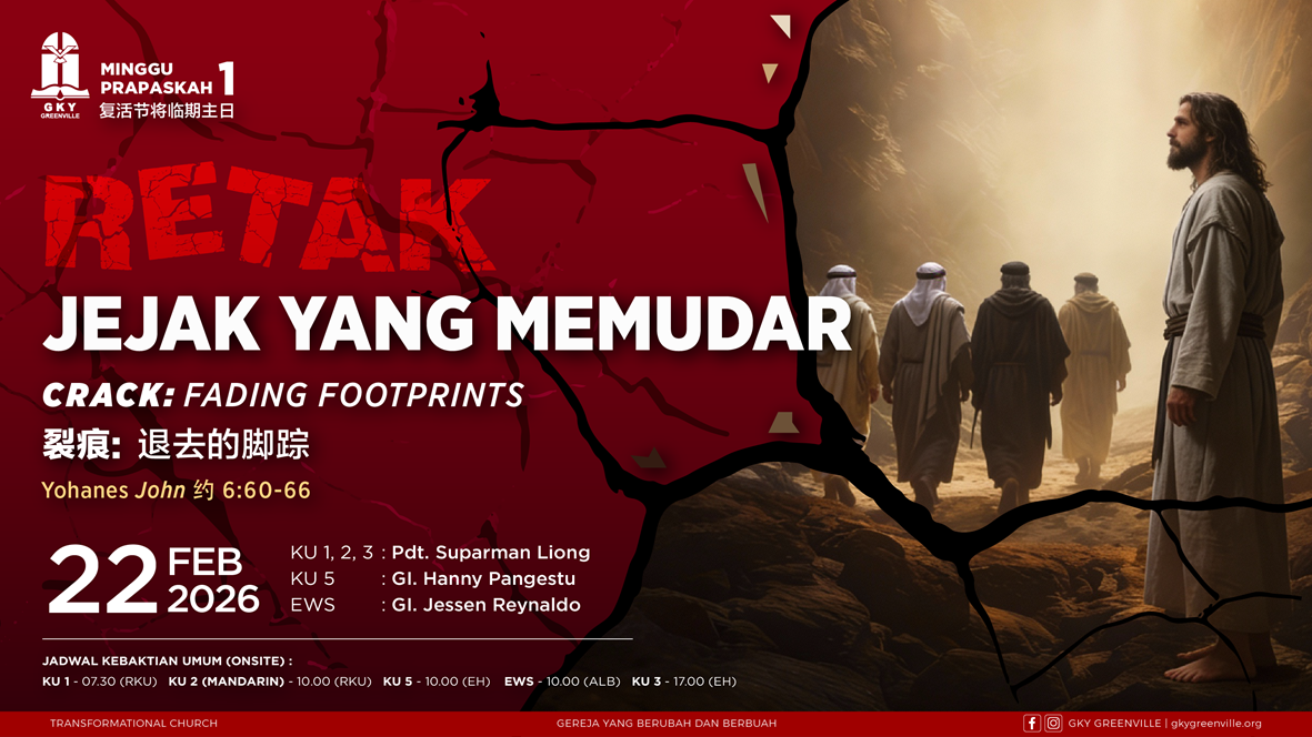GKY Greenville terpanggil menjadi gereja yang transformasional, memperlengkapi jemaat untuk terus berjalan “one step to the right” dan menjadi saksi Kristus bagi dunia.