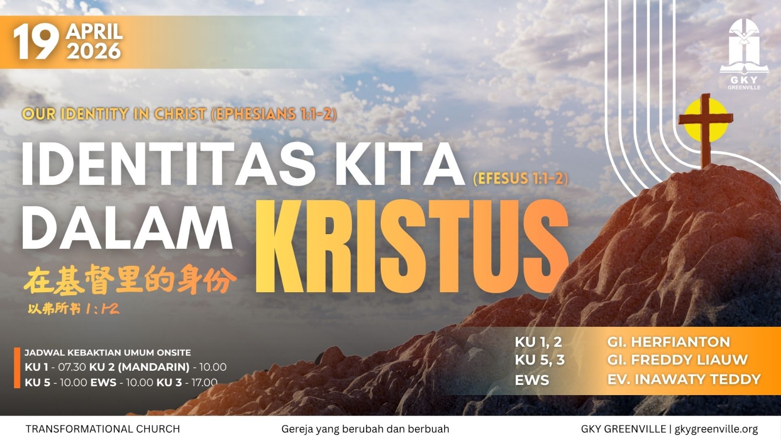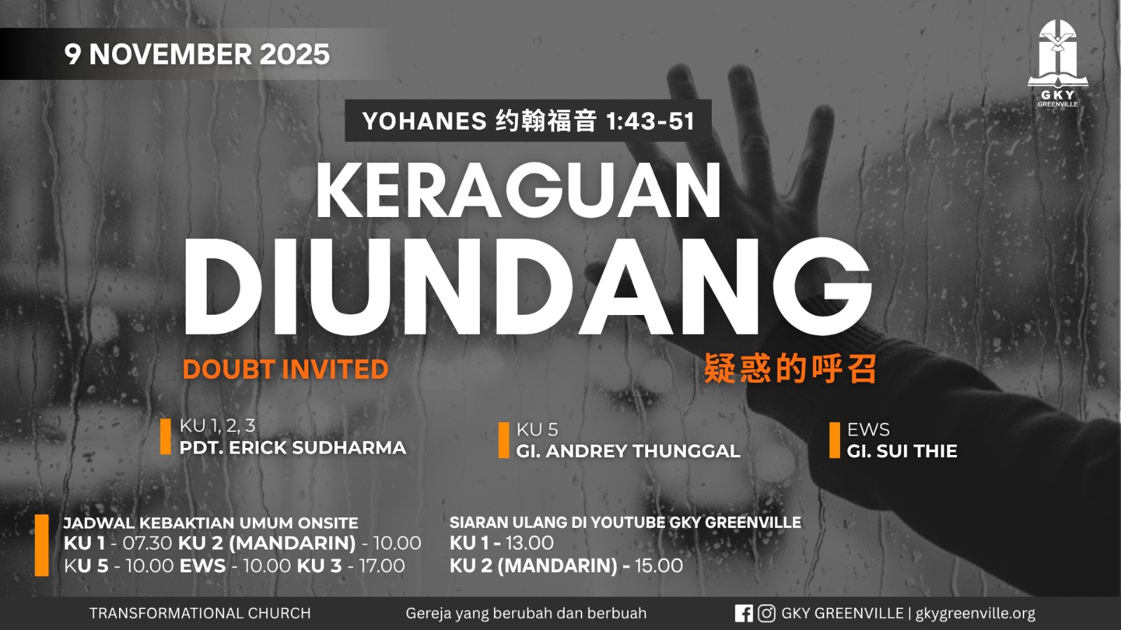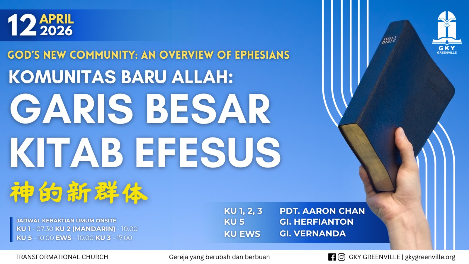 GKY Greenville terpanggil menjadi gereja yang transformasional, memperlengkapi jemaat untuk terus berjalan “one step to the right” dan menjadi saksi Kristus bagi dunia.